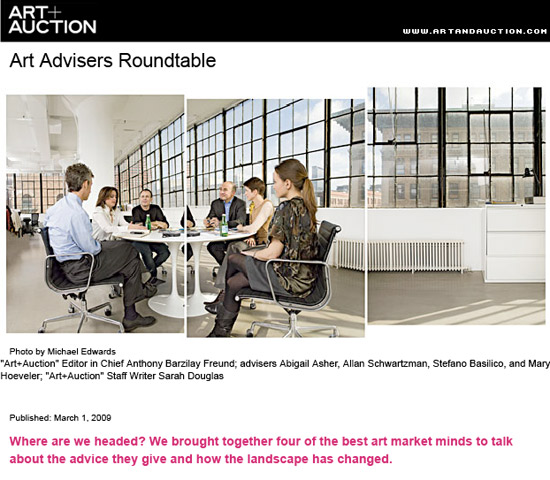 SARAH DOUGLAS: What does an art adviser do? Are the terms art adviser and art consultant interchangeable? ABIGAIL ASHER: When I hear art consultant I break out in hives. Don't you? ALLAN SCHWARTZMAN: At some point in the '90s, the business cards went from interior decorator to artconsultant. MARY HOEVELER: As an art adviser, you establish a longer-term relationship. An art consultant is typically more project-oriented. ALLAN SCHWARTZMAN: I think of myself more as a curator.MARY HOEVELER: Curator isn't exactly accurate either, because there's a lot of knowledge about the market that enables me to do what I do. ABIGAIL ASHER: Clients are looking for someone with curatorial expertise who is watching their back with investments. STEFANO BASILICO: When I had a gallery, my clients were my artists. Now my job is to protect my collector clients. But the activity is the same: to make sense of art — in this case, to put together a whole that is greater than the sum of its parts. ALLAN SCHWARTZMAN: Value in the marketplace is an essential part of the advice. Having said that, I don't think any of us would ever work with somebody whose desire is to be an art investor.MARY HOEVELER: They do want to make sure the price is appropriate and that we believe there is going to be some future for an artwork.SARAH DOUGLAS: Mary, you started with the Citibank art advisory. Was there more of an expectation there that art would play an investment role with your clients? MARY HOEVELER: The assumption was always that because it was within a bank, we were an art-investment advisory group. We weren't. We made it very clear to prospective clients that this was not about putting together a diversified asset-allocation portfolio. We had clients who would come to us and say, "I'm allocating 2 percent of my portfolio to art. Just buy stuff." We shied away from that. Neither at Citibank nor in my present practice do I take on people with strictly investment mentalities. SARAH DOUGLAS: In the recent boom, there seemed to be a glut of art advisers. Did this give the profession a bad name? ALLAN SCHWARTZMAN: Most people who do this are gatekeepers. They know rich people, they have some access to art, and they provide people who may be interested in collecting art with access. Having said that, I believe that whether it's art advisers, dealers, curators or critics, most people in the contemporary-art field are enthusiasts more than experts.